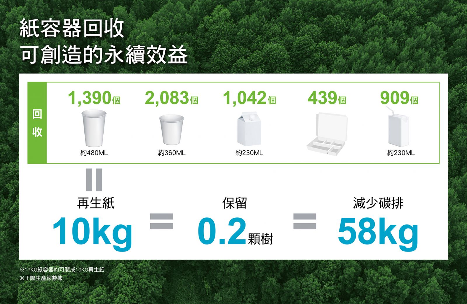 正隆持續推動廢紙容器的再生循環,2023年進一步於大園廠增設6.6萬公噸產能再生白漿線,提高廢紙容器再生處理量能;2024年底,竹北廠紙容器認證處理量能更通過政府審核,提升50%至3,000噸/月,合計全集團廢紙容器認證年處理量高達17.6萬公噸,再生處理量能位居全球前列,可消化全台超過50%的廢紙容器資源,間接貢獻減碳效益達102萬公噸。此外,正隆積極號召在地永續實踐夥伴,包括公會、學校、政府和企業,透過多元合作,擴大減碳影響力,並開放工廠參觀,喚起社會對永續責任的關注。