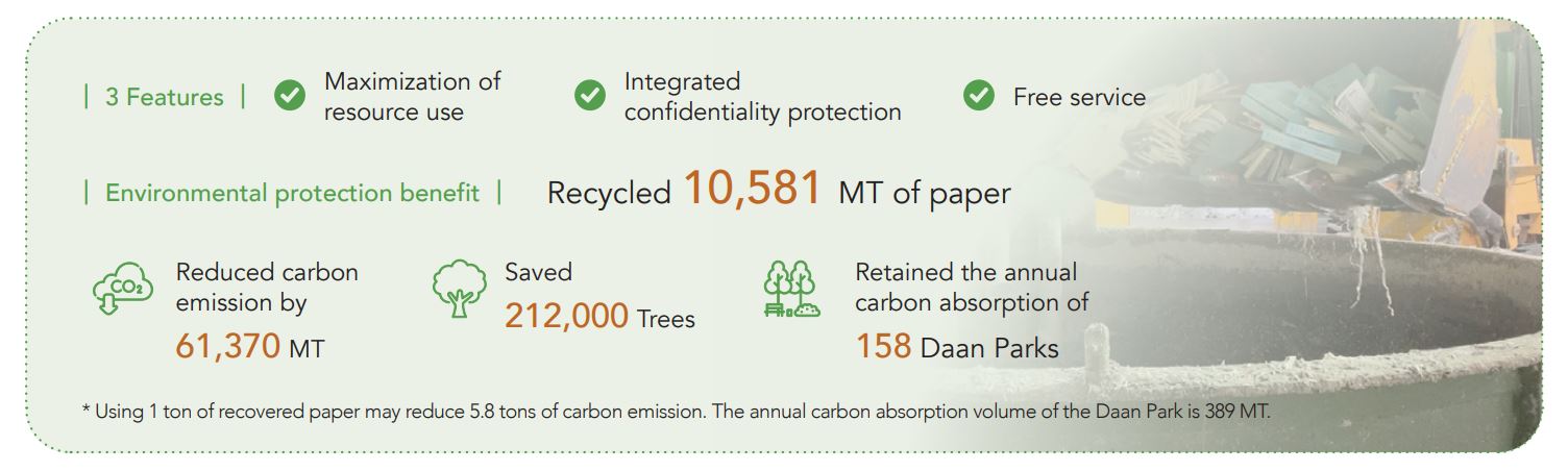 In 2013, we began to provide free document destruction service by exerting our pulping expertise in paper recycling to repay society through the innovative use of our experience recycled paper papermaking. By doing so, we prove the possibility of reducing environmental impact while achieving economic efficiency. Over the last 10 years, we have helped 400 partners, including government entities, listed companies, banks and insurers, and national defense units, to destroy 10,581 MT of confidential documents through pulping for free to recycle paper for producing over 45 million packs of eco-toilet tissue to create win-win.
