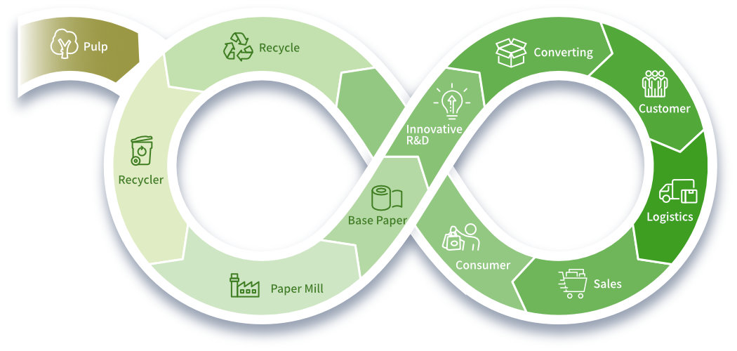 For a product life circle which refers to phases of material use, product design, green manufacturing, logistics and distribution, and the end-consumer, we adopt a circular economy model of “renewable resource - paper making - packaging” to research and develop innovative and diverse green products and services, aiming at creating the circular benefits of secondary forests. In recent years, we have been actively integrating the total circulation of three major resources: products, energy, and water through the low-carbon S.M.A.R.T paper strategies: Subtraction-reducing resource consumption use, Materials-turning waste to energy, AI-smart production-sales, Recycling-reusing recovered paper, and Technologies-advanced processes to transform traditional factories into eco-friendlier smart and recycling plants.