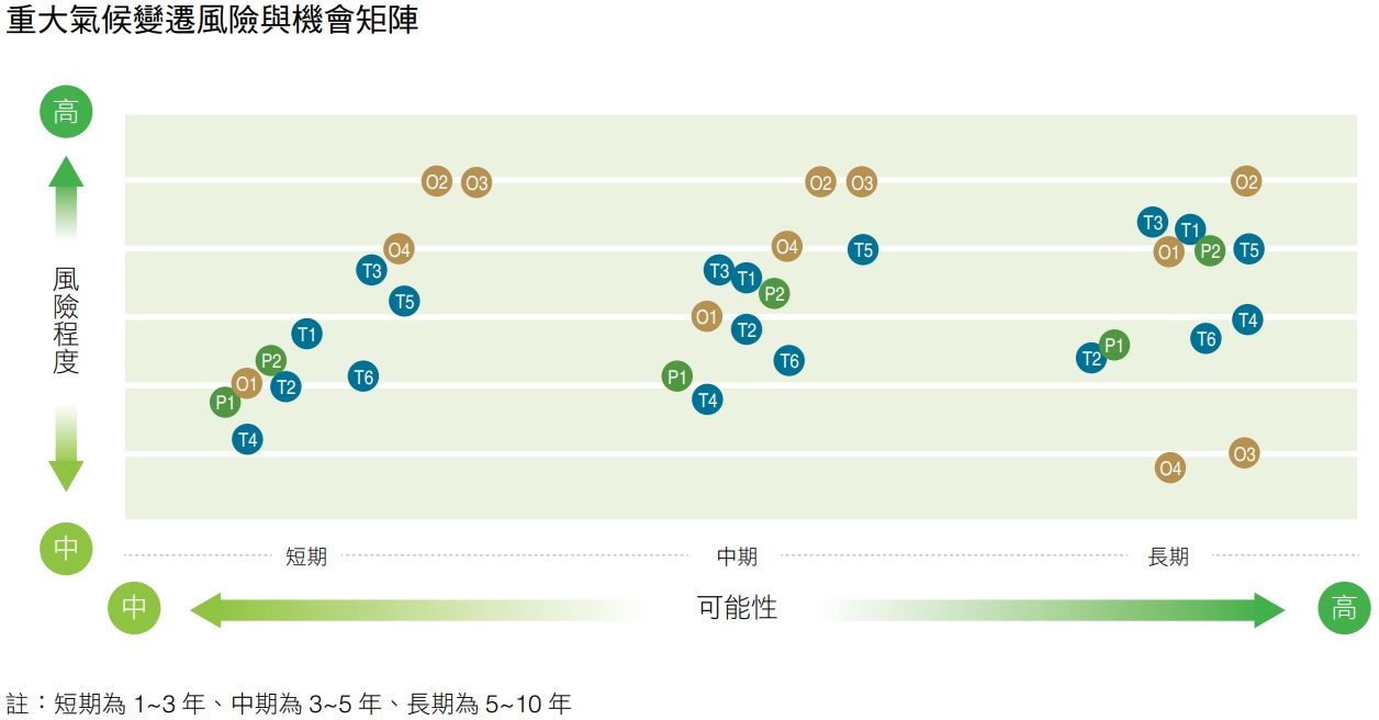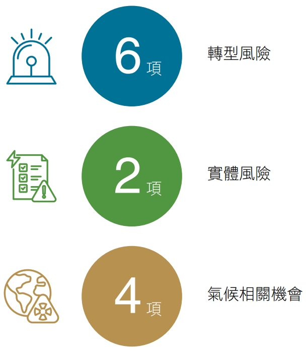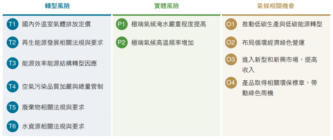 | 治理 | 董事會下增設「企業永續委員會」,跨部門整合氣候行動資源與進展,委員會下亦成立「氣候變遷暨循環經濟辦公室」,由總經理擔任召集人,積極管理氣候變遷議題並採取行動,且每季向董事會報告 |