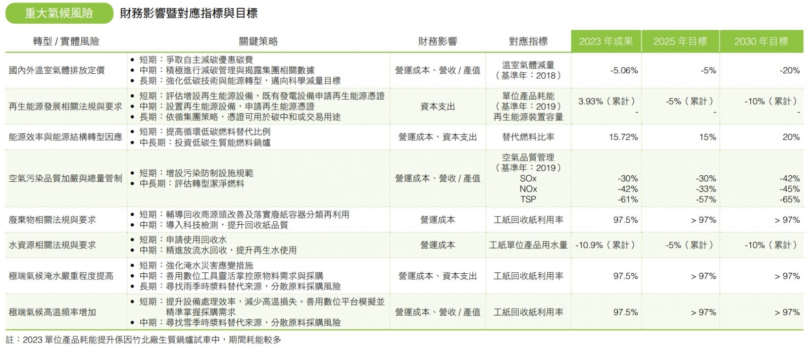 訂定氣候相關績效指標與量化目標,定期追蹤達成度,並對外透明揭露 |
