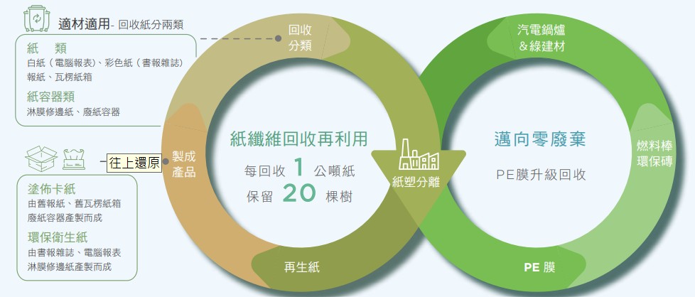 透過產品生命週期:原料使用、產品設計、綠色生產、物流配送,到最終端的消費使用,以「再生資源─造紙─包裝」的循環經濟模式,近年積極透過S.M.A.R.T.(Subtraction 資源減用、Material 轉廢為能、AI 產銷智能、Recycling 回收再生、Technologies 先進製程)低碳智紙五大策略,整合產品、能源、水3大資源全循環,將傳統工廠打造為更環保的智慧再生工廠。