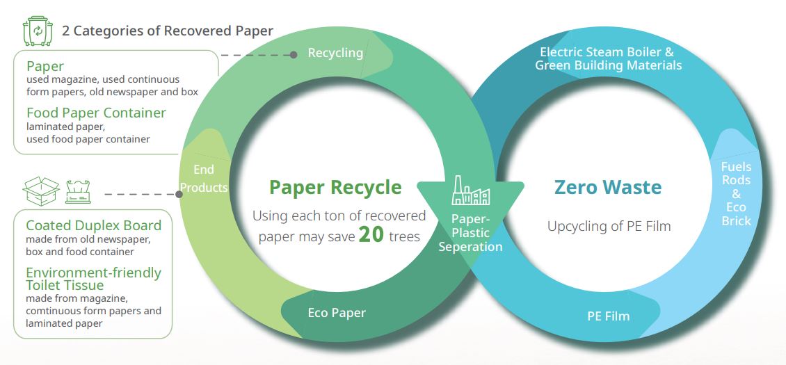 To tackle the problem of waste food paper container disposal, we also believe that it is responsible for papermakers' responsibility to engage in recycling waste food paper containers. Therefore, we made advanced deployment by investing an "efficient film laminated paper treatment system" in 2018 to become the first company completely recycling food paper containers. In same year, started the "upgrading of recovered paper supply chain plan" and deepen the benefits of the circular economy. We supported over 167 recovered paper suppliers in Taiwan to upgrade. Reduced paper sludge by 50% and decreased the energy consumption by 10% by implementing source identification, and enhanced the profit and competitiveness of recovered paper supply chain. The plastic laminate is recycled into green fuel and eco-friendly building materials products. Pre-planned to help solve the growth of the takeout catering culture was driven by the epidemic and respond to the stop using plastic bottles policy in Taipei city in 2022 to realize benefits with a creative multi-win sustainability business model. With the goal of continuously deepening the recycling efficiency, the recycled bleached pulp line of Tayuan Mill, which will operate in 2023H1.