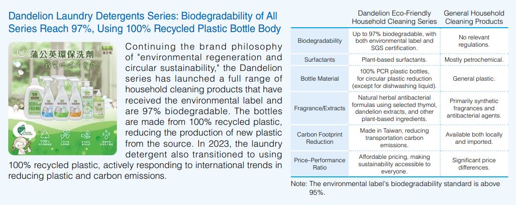 CLC also introduced the "Dandelion" eco-friendly multi-purpose bag, reducing plastic usage by combining packaging with garbage bags. Since its launch, 1.13 million sets have been sold, cutting plastic use by 38,000 kilograms. In 2022, CLC expanded the "Dandelion" line to include eco-friendly household detergents and, in 2023, laundry detergents with 100% recycled plastic bottles, offering consumers a wider range of green products and contributing to Earth's sustainability.