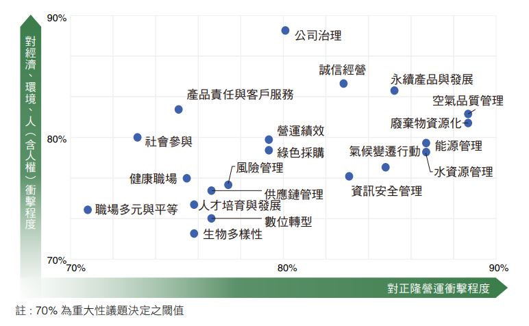 有鑑於資安風控重要性日增,本公司2023年新增1個高度重大主題「資訊安全管理」,結合誠信經營、永續產品與發展、氣候變遷行動、廢棄物資源化等高度重大主題,繪製重大議題矩陣並進行回應。鑑別出重大議題後,由內部高階主管與ESG小組成員進一步針對20項重大主題進行正負面衝擊分析執行「盡職調查」,評估重大主題於正隆價值鏈的影響範疇,並於ESG委員會提報董事會,會議決議後通過決定出重大議題。正面衝擊以公司目前策略與管理方針評估各項議題,對經濟、環境及人(含人權)三面向所產生之正面效益及發生可能性,負面衝擊假設組織不採取行動,導致未能預防或減緩負面衝擊,以評估各項議題於三面向所造成的嚴重程度及發生可能性。