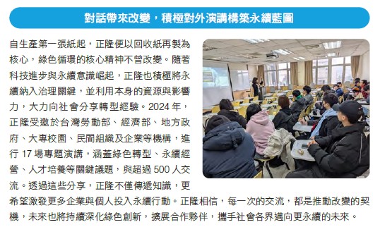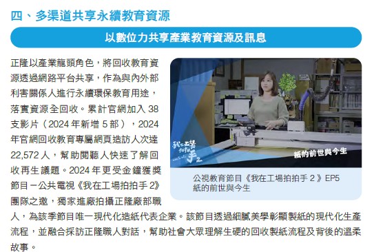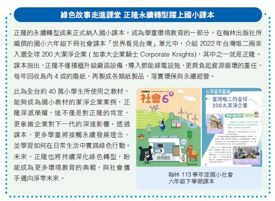 每一張紙都是樹木的延伸,回收紙可以創造二次森林。深信基礎教育是促使資源正確循環再生的動力,正隆積極呼應聯合國SDGs 4優質教育願景,自2014年起在全台打造「紙圖書館」,為偏鄉注入閱讀與環教資源,讓師生得以透過閱讀、認識與接觸紙資源,學會守護與珍惜環境的美好。近年來,正隆積極透過串接多方利害關係人,以共創紙圖書館、推動永續教師研習營、開放工廠參觀等多元創新模式,為社會扎根二次森林永續價值。