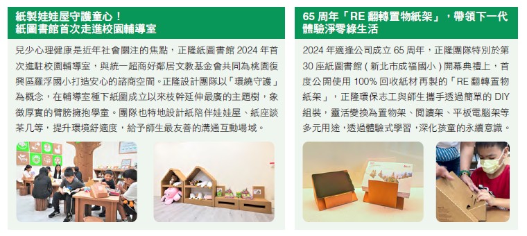 關注「閱讀」與「陪伴」對孩童心理健康成長的重要性,正隆持續開拓永續紙材在各式多元場域的應用。2024年首度將紙圖書館的概念運用在改造學校輔導室,在教育學習的基礎上,提供師生溫暖的諮商與溝通空間,盼在學童心中種下美好永續種子,為台灣成為國際永續典範奠定良好基礎。